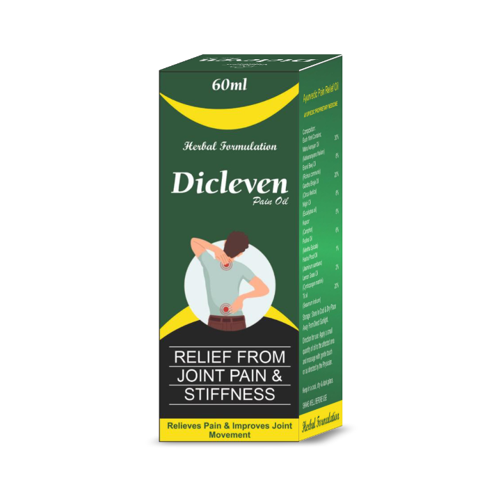 DICLEVEN OIL is a powerful Ayurvedic pain relief formulation enriched with natural herbs and essential oils known for their anti-inflammatory, analgesic, and muscle-relaxant properties. It provides fast and long-lasting relief from joint pain, muscle stiffness, backache, sprains, arthritis, and general body aches. The unique blend of Ayurvedic ingredients penetrates deep into the affected area to reduce pain, swelling, and stiffness, promoting mobility and comfort.